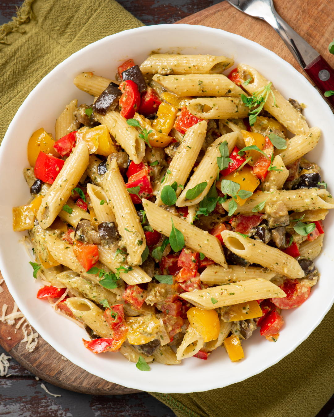 Al dente pasta tossed with fresh veggies, olives, and herbs in a light, zesty vinaigrette.